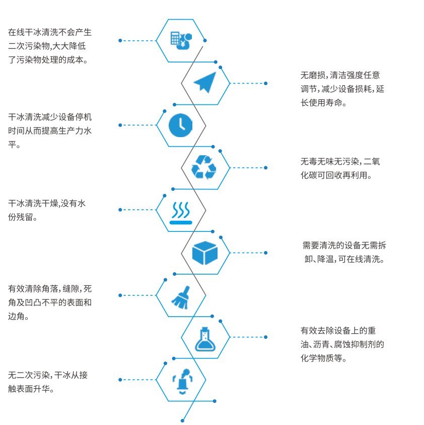 万通干冰清洗技术具备环保无毒,可以降低停工工时,减少设备损坏,有效的清洗高温的设备,减少或降低溶剂的使用,增进保养效率,减少生产停工期、降低成本、提高生产效率的优势。